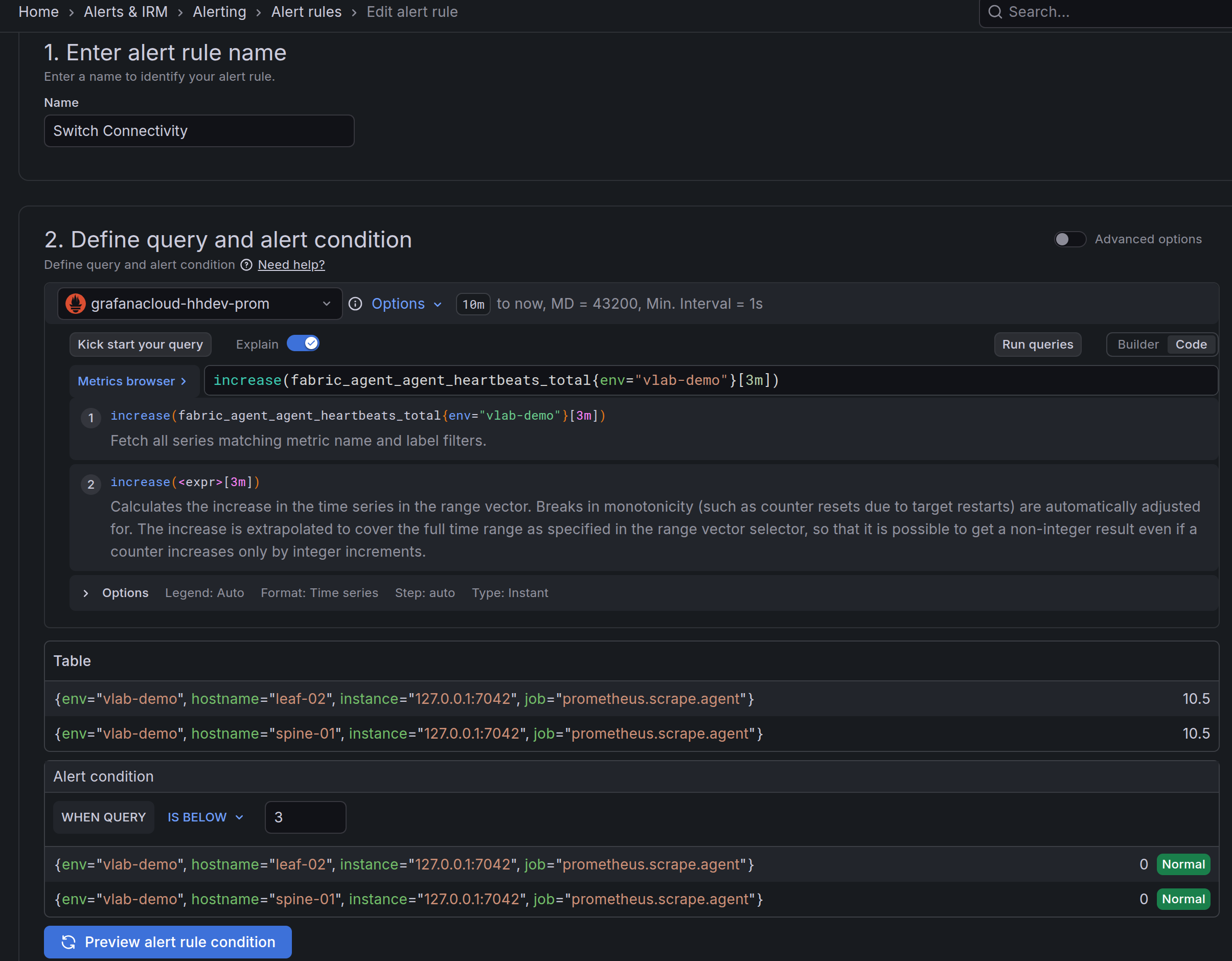 The alert rule queries the increase of the fabric_agent_agent_heartbeats_total metric. In normal operation the switch agent sends two increments every minute. The prometheus increase function will extrapolate the value for the total time range which leads to a higher reported number than is actually observed, this is not a concern. Select a value for the Alert condition according to your operational needs. The example has a value of 3, which allows for some delays and drops before firing the alarm.